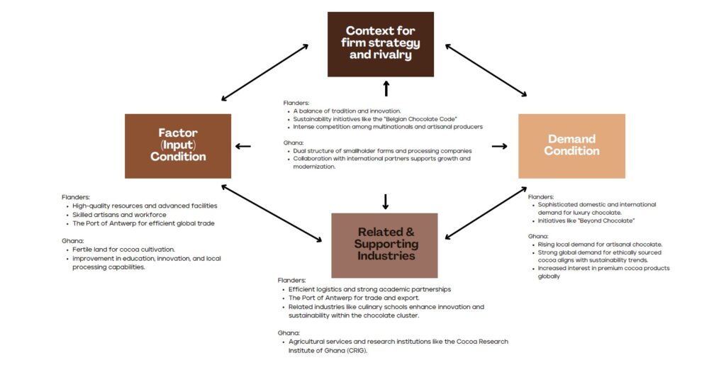 These interact with government policy and have the chance to shape competitiveness outcomes. The model highlights how localised ecosystems—such as Flanders’ chocolate industry or Ghana’s cocoa sector—create and sustain competitive advantage.