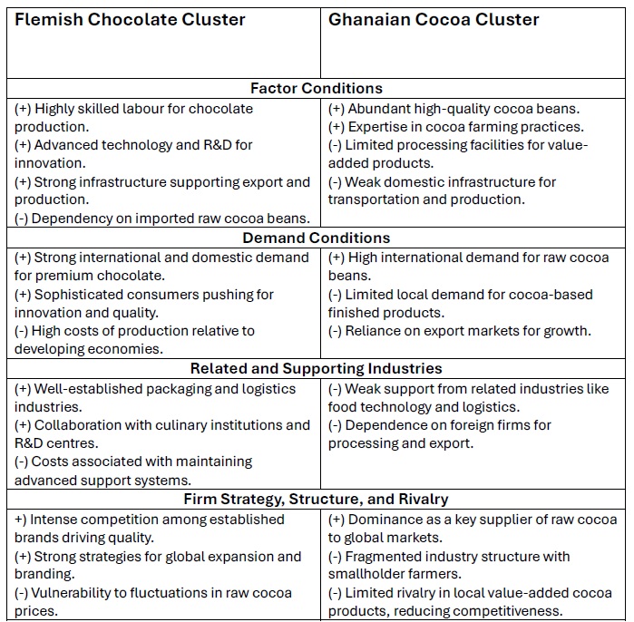 The Flemish and Ghanaian clusters illustrate the duality of global competitiveness: advanced economies lead in innovation and branding, while developing economies provide essential raw materials yet remain locked in low-value activities. Applying Porter’s Microeconomics of Competitiveness reveals that prosperity grows not from isolation, but from mutual upgrading within interconnected clusters.
