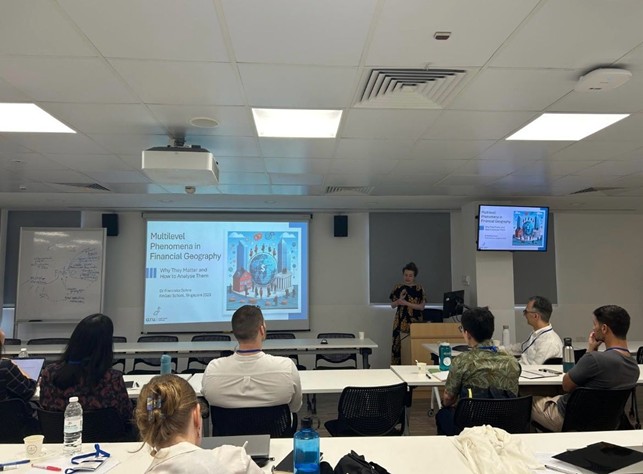 The event brought together at the National University of Singapore (NUS), from 24 to 25 February 2025, 34 early career researchers and 6 instructors from 15 countries, creating a vibrant environment for knowledge exchange and professional growth. The program featured keynote lectures, thematic sessions, and interactive workshops. The school began with an inspiring welcome speech on The 7 Habits of Successful Researchers by Prof. Dariusz Wójcik, followed by an insightful discussion on theory development in financial geography chaired by Prof. W. Nathan Green. This was succeeded by a session on methodology in financial geography led by Prof. Franziska Sohns, and concluded with a thematic session in which Prof. Silvia Grandi shared key insights on research impact and financial geography, sparking a lively discussion on making research matter. Moreover, other themes were selected for their relevance to current debates in financial geography and their potential to stimulate discussion among participants. Social activities complemented the academic program, fostering informal interactions and lasting connections.